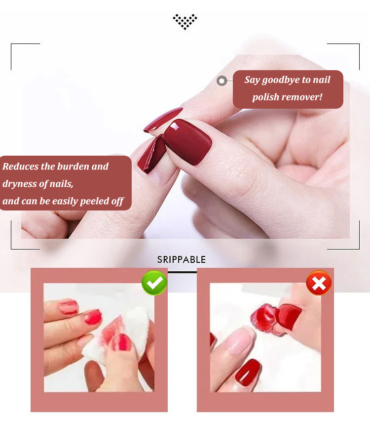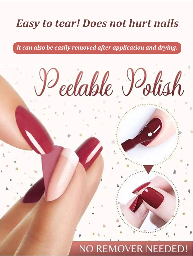 Hate the UV burn? Get perfect nails without the lamp! ✨No polish remover needed. Just peel it off! 👋Water-based formula that lets your nails breathe. 🌬️Finally! Nail polish without the harsh chemical smell. 🌿From Nude to Bold: Colors for every occasion. 🎨Safe and gentle, even for sensitive nails. 🛡️Quick-drying & smooth finish in minutes. ⏱️Compact and chic bottles, perfect for your purse. 👜